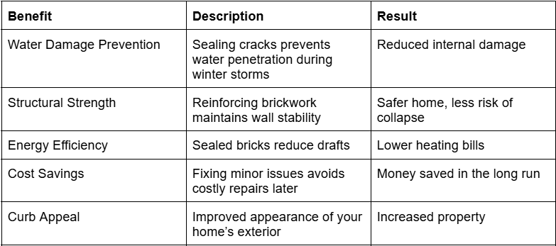 By repairing your brickwork before winter, you ensure your home remains protected against the elements and avoid costly repairs down the road. Here are the primary benefits you can expect.